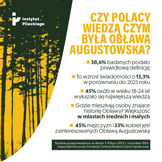 Obława Augustowska jest wydarzeniem, które coraz bardziej zakorzenia się w świadomości Polaków. W ciągu ostatnich dwóch lat wiedza na ten temat znacząco wzrosła (o 13,3 punktu procentowego, z 25,3% do 38,6%). Prawidłową definicję - „akcja pacyfikacyjna przeprowadzona w lipcu 1945 r. na Polakach przez Sowietów” wskazało obecnie blisko 2/5 dorosłych Polaków, podczas gdy w 2023 roku — tylko co czwarty.