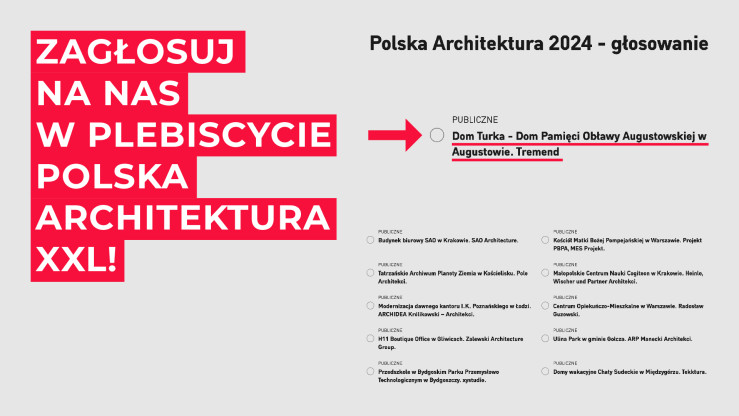 Dom Pamięci Ofiar Obławy Augustowskiej zaprojektowany przez pracownię Tremend został nominowany do nagrody za najlepszą realizację architektoniczną w kategorii "obiekt publiczny" w plebiscycie Polska Architektura XXL 2024.